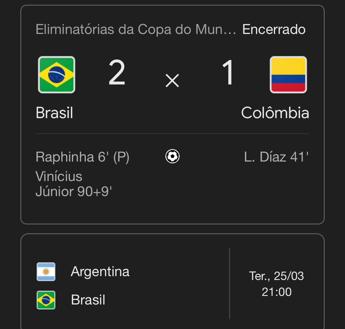 Um jogo cheio de emoções e acidentes chocou-se fortemente cabeça com cabeça com goleiro Alisson caindo desacordado foi substituído ainda no primeiro tempo no segundo tempo o goleiro Alisson também foi substituído já que ele levou também um tombo na cabeça neste momento e o Brasil seguiu batalhando e no finalzinho não dá nos acréscimo Vini Júnior seja um golaço contando com o adesivo da zaga da Colômbia Brasil 2 a 1 e enfrentar Argentina na próxima terça-feira é o Brasil